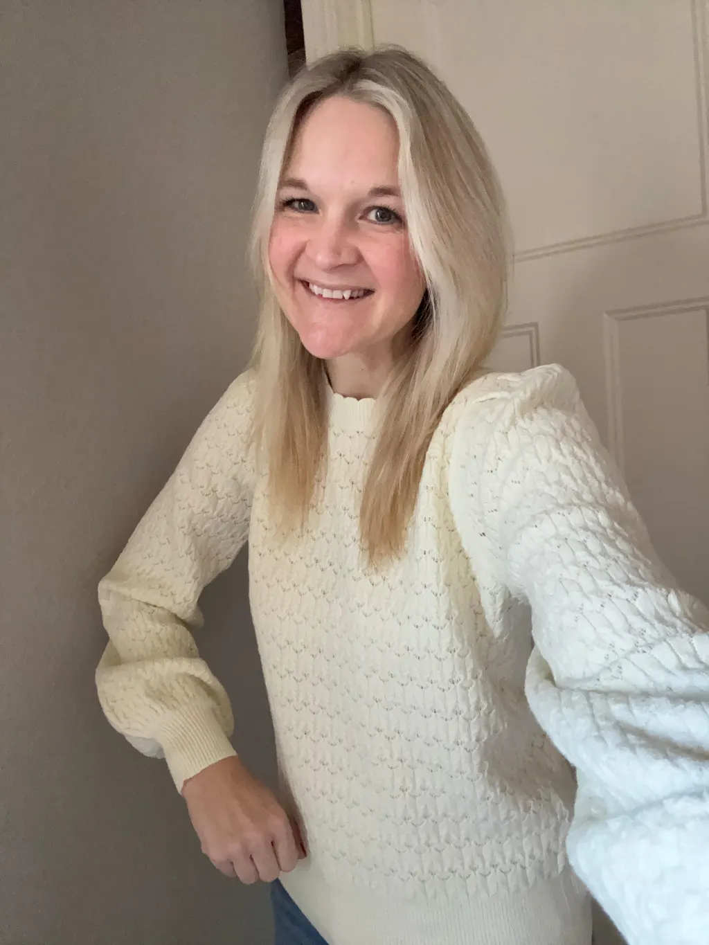 This sweater quality is outstanding. It is luxurious and beautiful. I do think you need a nude colored undershirt. The sleeves are absolutely adorable. The ruffled neck will steal your heart! Just so so cute! In love!! I am 5β4, 124 pounds. Got a small and itβs perfect.