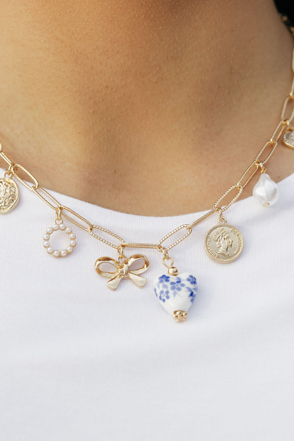 ¡Presentamos el collar Anya Charm! Con grandes presillas de cadena y un cierre de palanca, este collar es elegante y seguro. El gran colgante de perlas rodeado de colgantes azules,...