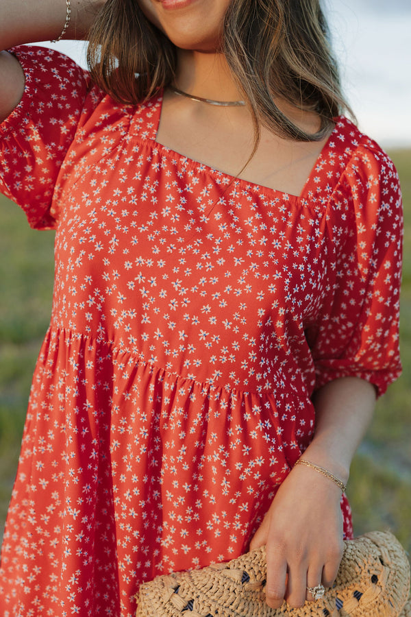 Ready to turn heads in the Smitten Dress-Red. With a daring slit square neckline and playful puff sleeves, this knee length dress oozes confidence. The bold floral pattern adds a...