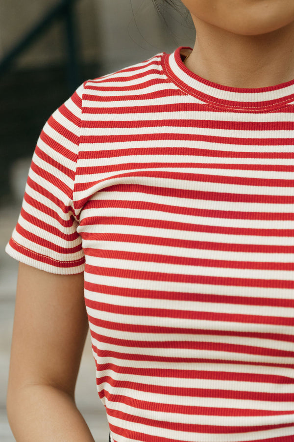 Enjoy a relaxed fit with our Russ Top in Red and Cream stripes. Perfect for a casual day out, this top combines style and comfort for a laid-back yet fashionable...