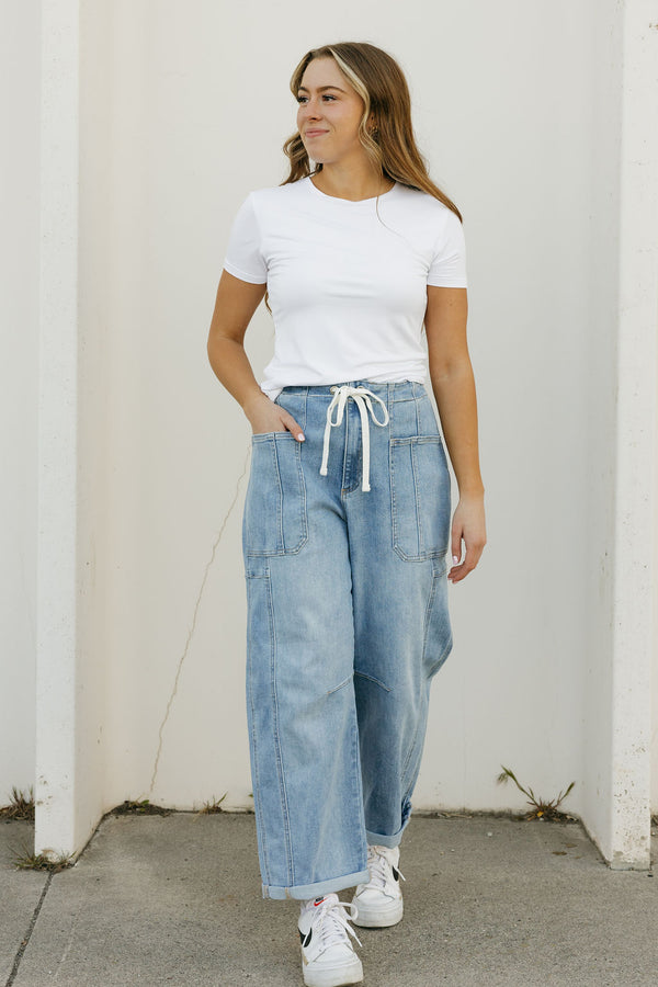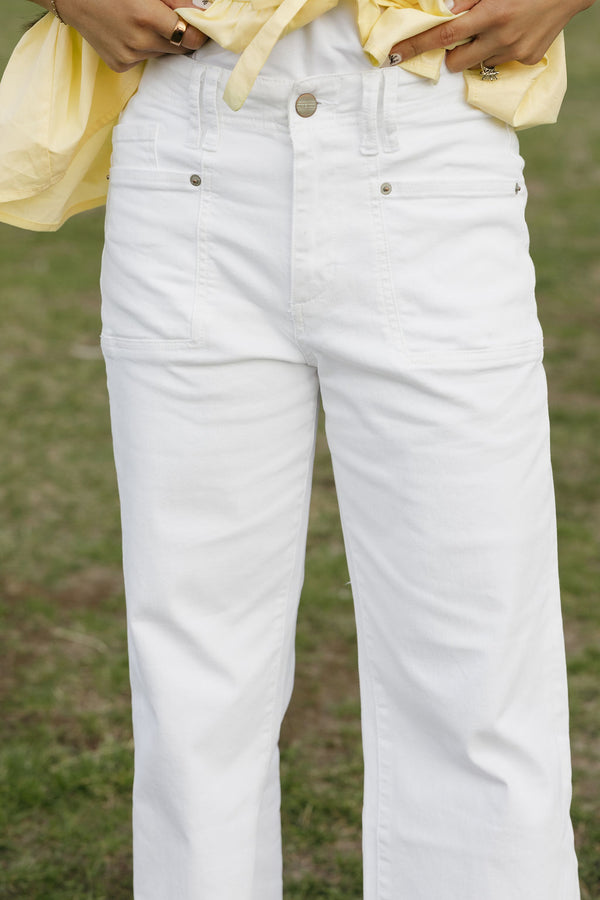 Step out in style with the Tandy Denim-White! These high-waisted jeans feature a zipper button fly and charming square pockets on both front and back. The wide-leg cut adds a...