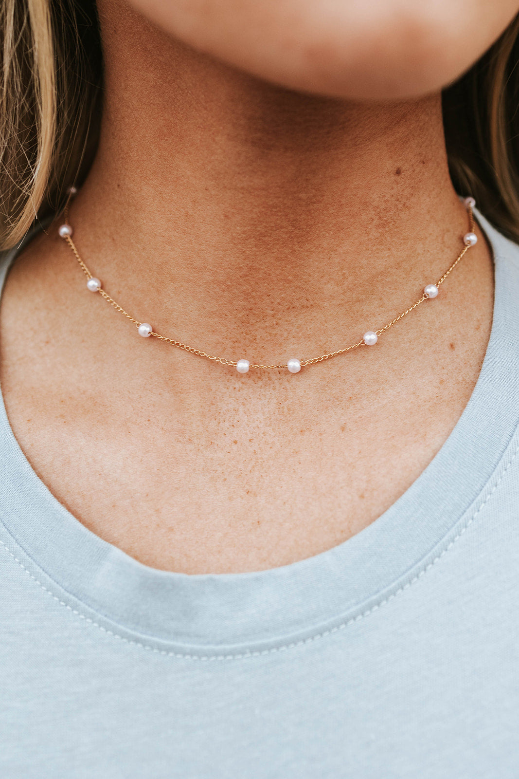 This dainty necklace is bold and simple all in one. The Pearl Choker comes in a gold-plated finish with subtle pearl like beads throughout the chain. There is also a silver option that is just as beautiful.